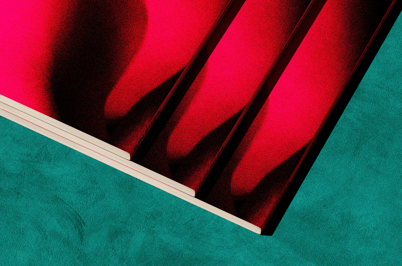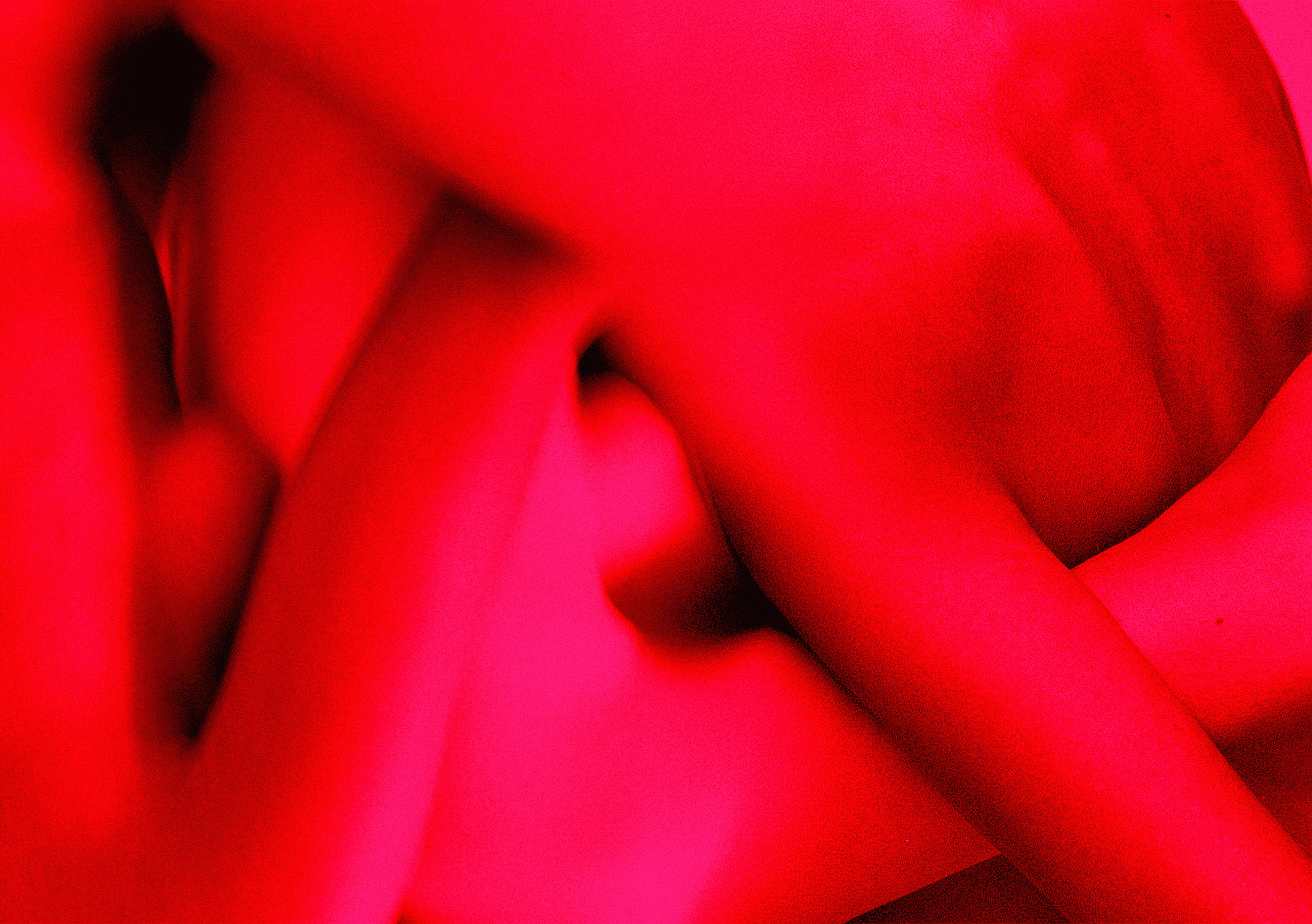 O moodboard guia o projeto para uma estética física e direta. As referências enfatizam corpos, textura e proximidade, em tons de vermelho e rosa que criam uma atmosfera quente e intensa